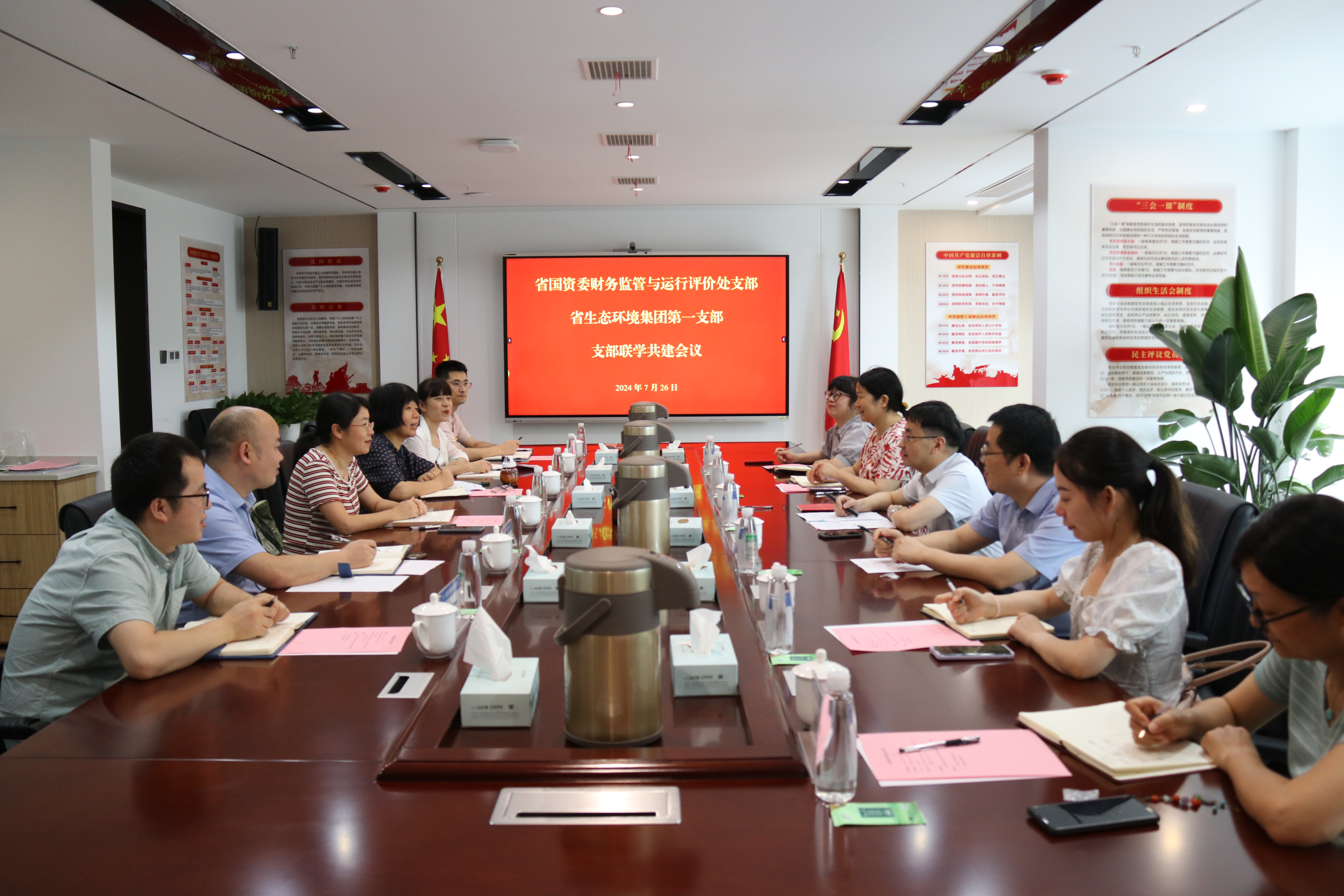 7月26日下午,省國資委財管運行處黨支部與省生態(tài)集團本部第一黨支部聯(lián)合舉辦了主題為“黨紀共學(xué)鑄忠誠,業(yè)財融合促發(fā)展”的黨建共建聯(lián)學(xué)活動。省國資委財務(wù)監(jiān)管與運行評價處黨支部書記、處長陳兵,省生態(tài)環(huán)境集團總會計師汪海燕,以及雙方黨支部部分黨員代表參加活動。